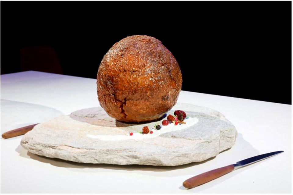 Una albóndiga gigante hecha de carne cultivada usando el ADN de un mamut extinto fue presentada en Nemo, un museo de ciencias en Países Bajos.