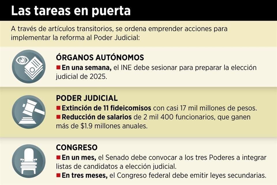 Desde el domingo que fue publicada, la reforma al Poder Judicial obliga a la extinción de 11 fideicomisos de órganos judiciales y a emprender acciones para la elección de Ministros, Magistrados y Jueces en 2025.