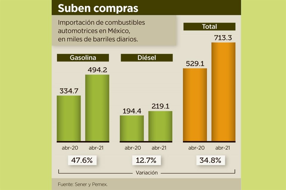 La recuperación en la demanda de combustibles y el estado de las refinerías de Pemex impulsaron en abril la importación total de gasolina y diésel en México en un 34.8 por ciento anual.