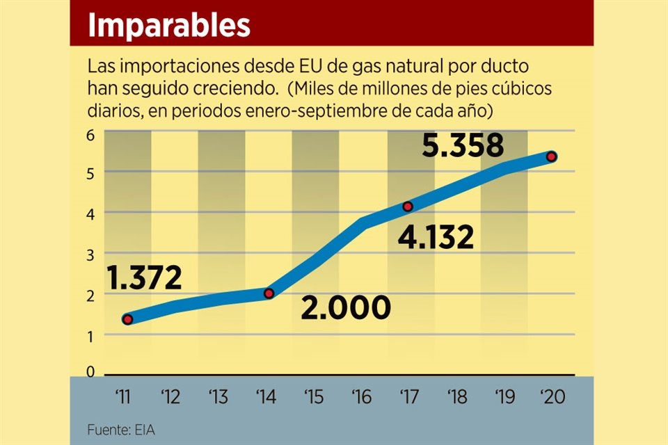 Ante la falta de capacidad de Pemex para atender la demanda nacional de gas natural, las importaciones de este combustible procedentes de Estados Unidos crecieron 6 por ciento durante los primeros nueve meses del año en curso respecto al periodo comparable del 2019, a un nuevo récord.