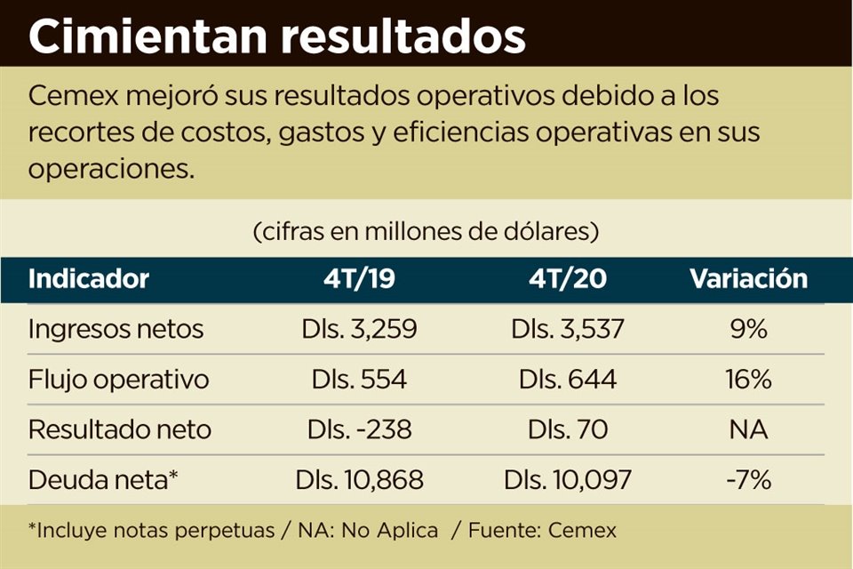 Apoyada por su estrategia Operación Resiliencia y por mayores volúmenes y precios en México, Cemex reportó ayer que en el cuarto trimestre del año sus ingresos netos y flujo operativo (Ebitda), ambos consolidados y medidos dólares, registraron un alza a tasa anual del 9 y 16 por ciento, respectivamente.