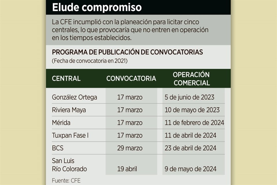 La Comisión Federal de Electricidad (CFE) no cumplió con las fechas para publicar las bases para licitar cinco centrales eléctricas.