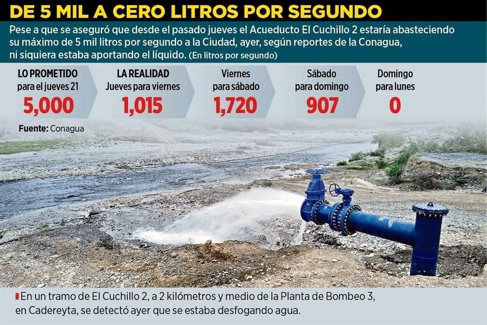Después de que fue inaugurado por segunda ocasión, y tras vencer el plazo de cinco días para que suministre los prometidos 5 mil litros por segundo de agua a la Ciudad, el Acueducto El Cuchillo 2 sigue surtiendo a "cuentagotas".