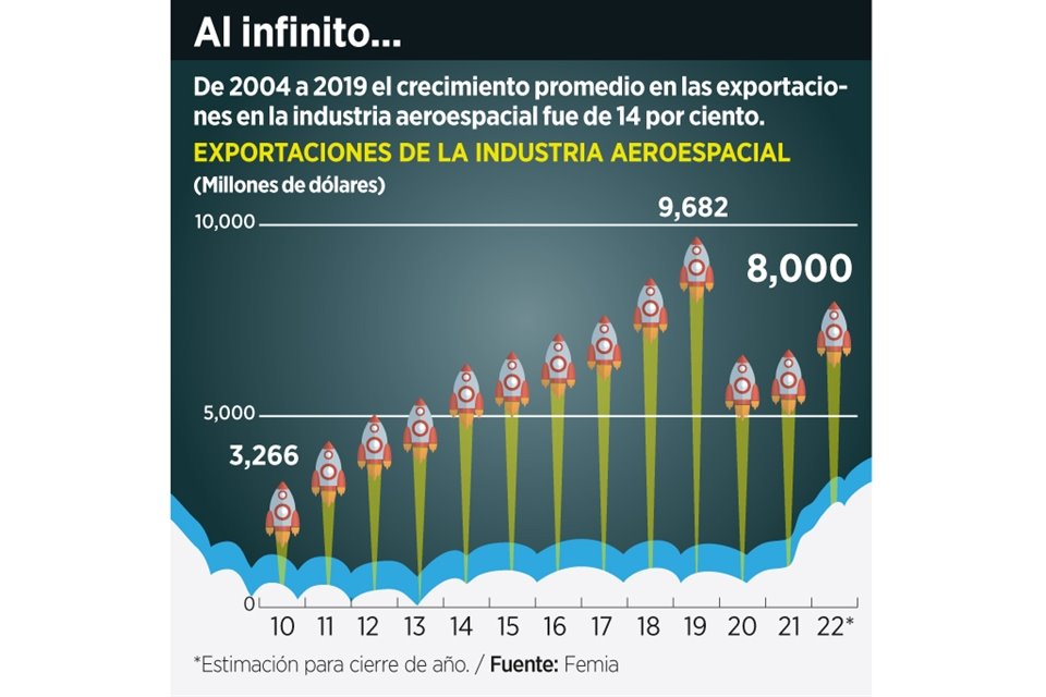 Al cierre del 2022, la industria aeroespacial prevé alcanzar ingresos por arriba de 8 mil millones de dólares con un crecimiento de entre 18 y el 20 por ciento respecto al año pasado, informó la Federación Mexicana de la Industria Aeroespacial (FEMIA).