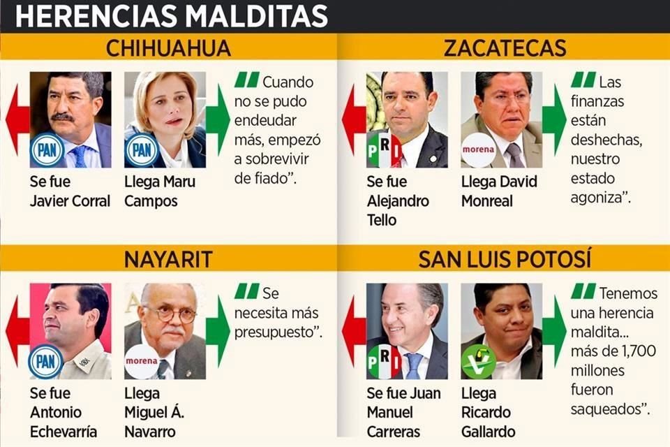 Tras asumir sus cargos, los nuevos Gobernadores de Chihuahua, Zacatecas, Sonora, Campeche, Nayarit y San Luis Potosí alertaron sobre el desastre financiero que recibieron en sus estados y que los tiene sin dinero para pagar nóminas, pensiones y proveedores.