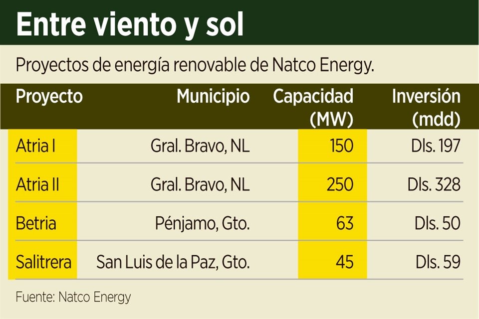 La compañía regia Natco Energy prepara una inversión de 634 millones de dólares para cuatro proyectos de generación eólica y solar, que estarán ubicados en Nuevo León y en Guanajuato.