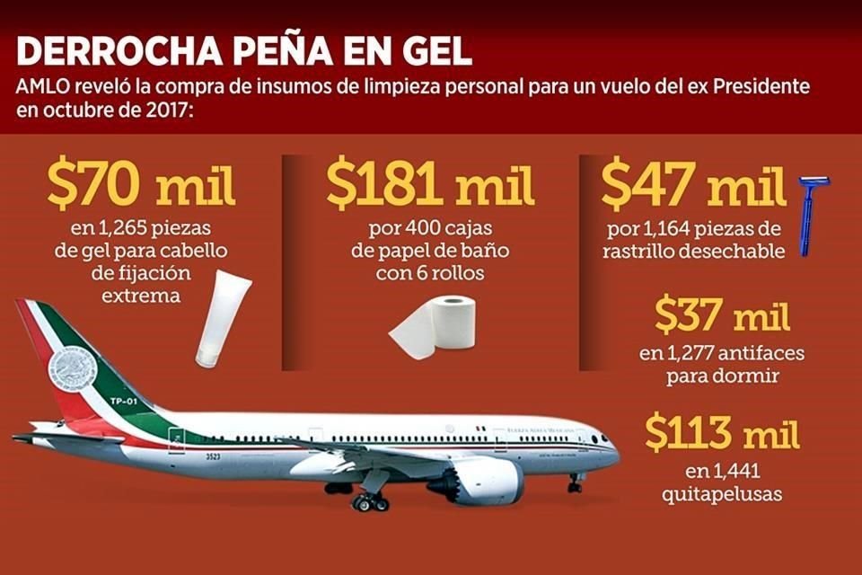El Presidente Andrés Manuel López Obrador advirtió ayer que se indagarán supuestas compras de productos de higiene personal por varios cientos de miles de pesos para surtir de kits en vuelos del ex Mandatario Enrique Peña Nieto.
