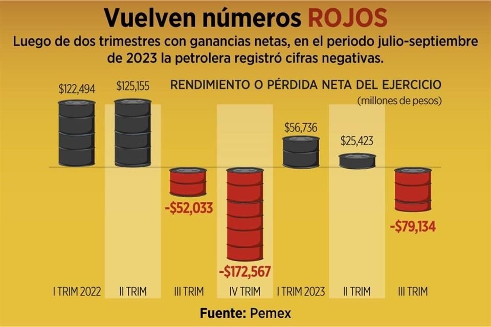 En el tercer trimestre del año, las pérdidas de Pemex crecieron 52 por ciento respecto al mismo periodo de 2022, pese a haber recibido apoyos del Gobierno que ya suman 806 mil millones de pesos.