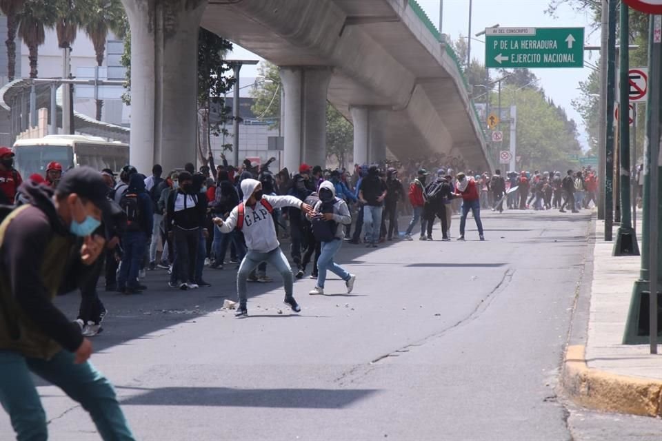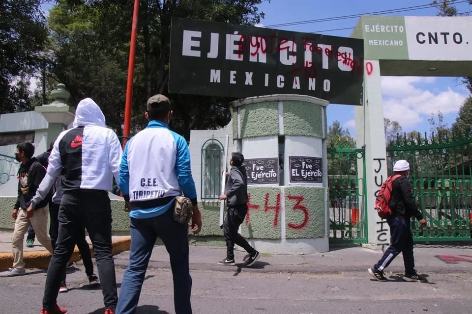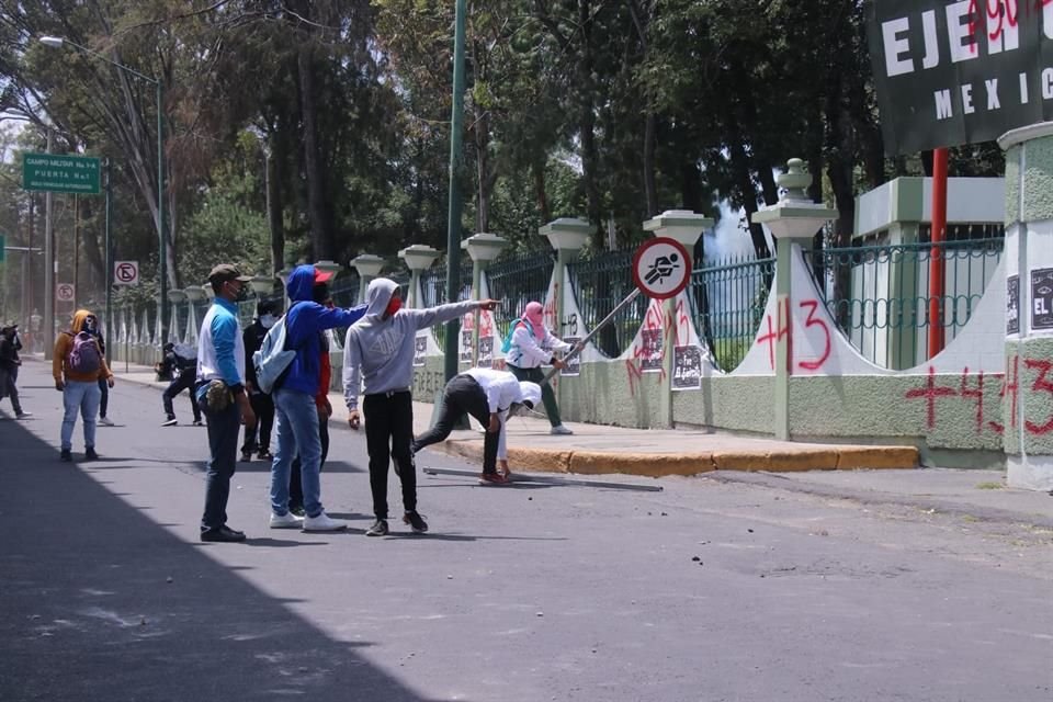 Normalistas con playeras como capuchas derribaron la puerta de acceso al Campo Militar #1, desde donde lanzaron petardos y piedras a elementos de seguridad.