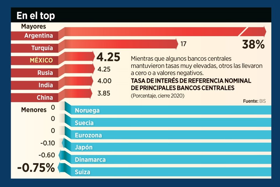 La tasa de referencia del Banco de México (Banxico) se ubicó al cierre de 2020 como la tercera más elevada de los 63 a los países que da seguimiento el Banco Internacional de Pagos (BIS).