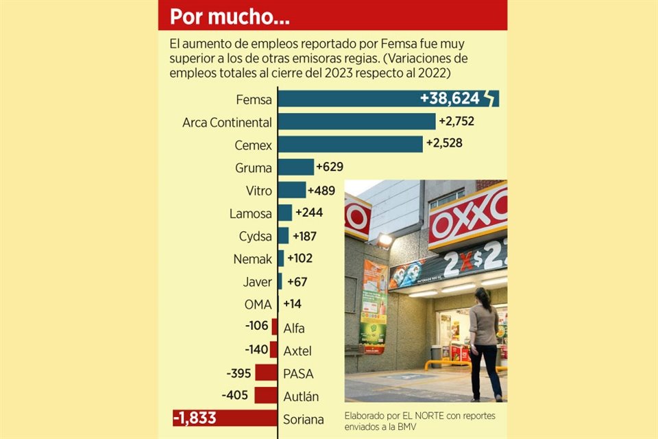 Durante el 2023, Femsa lideró -por mucho- en la creación de empleos netos entre las empresas regias que cotizan en la Bolsa Mexicana de Valores (BMV).