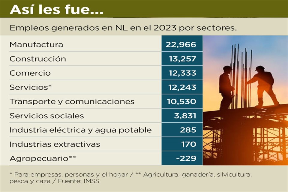 De los nueve sectores que clasifica el IMSS en sus indicadores de empleo, el de manufactura lideró en generación de puestos formales en Nuevo León en el 2023, con 22 mil 966 plazas.