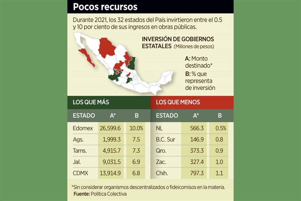 El año pasado, los 32 estados del País destinaron apenas entre 0.5 y 10 por ciento de sus recursos a obras públicas, revela el estudio "Finanzas públicas estatales explicadas con un billete", realizado por la organización Política Colectiva.