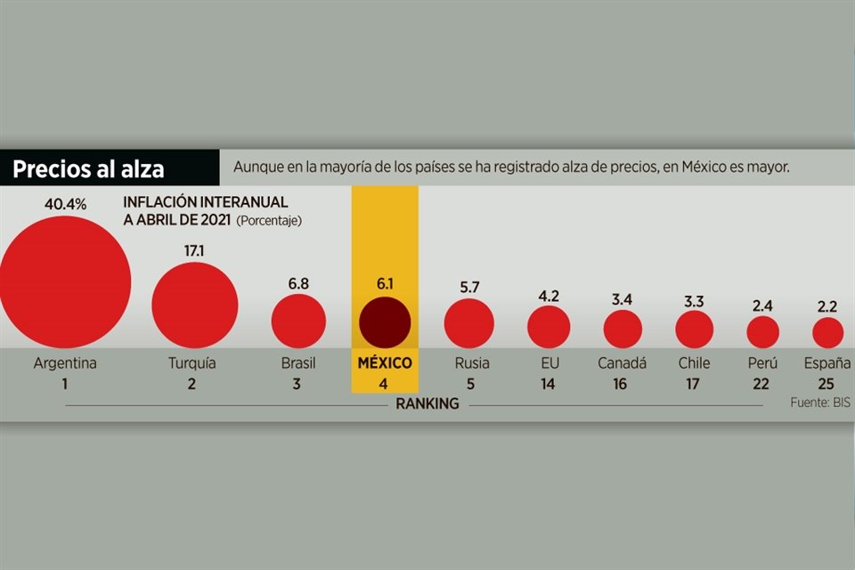 Al cierre de abril, México se colocó como el cuarto país con la mayor inflación interanual de una lista de 60 economías.
