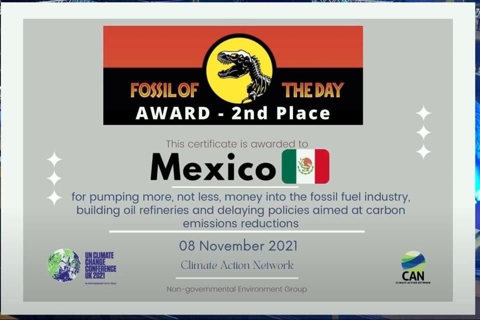 México fue nombrado este lunes como el "Fósil del Día" en la COP26 por un grupo de más de mil 500 organizaciones de la sociedad civil (OSC) debido a su falta de acciones para combatir el calentamiento global en la cumbre climática.