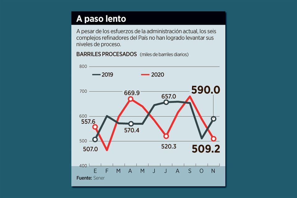 Las refinerías de Pemex no logran levantar: de enero a noviembre operaron al 38 por ciento de su capacidad.