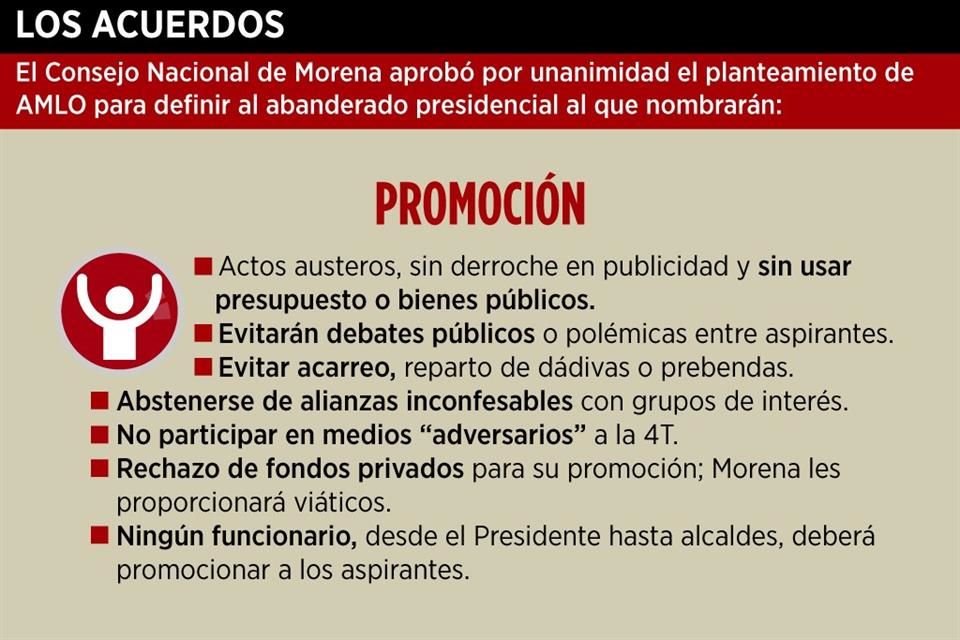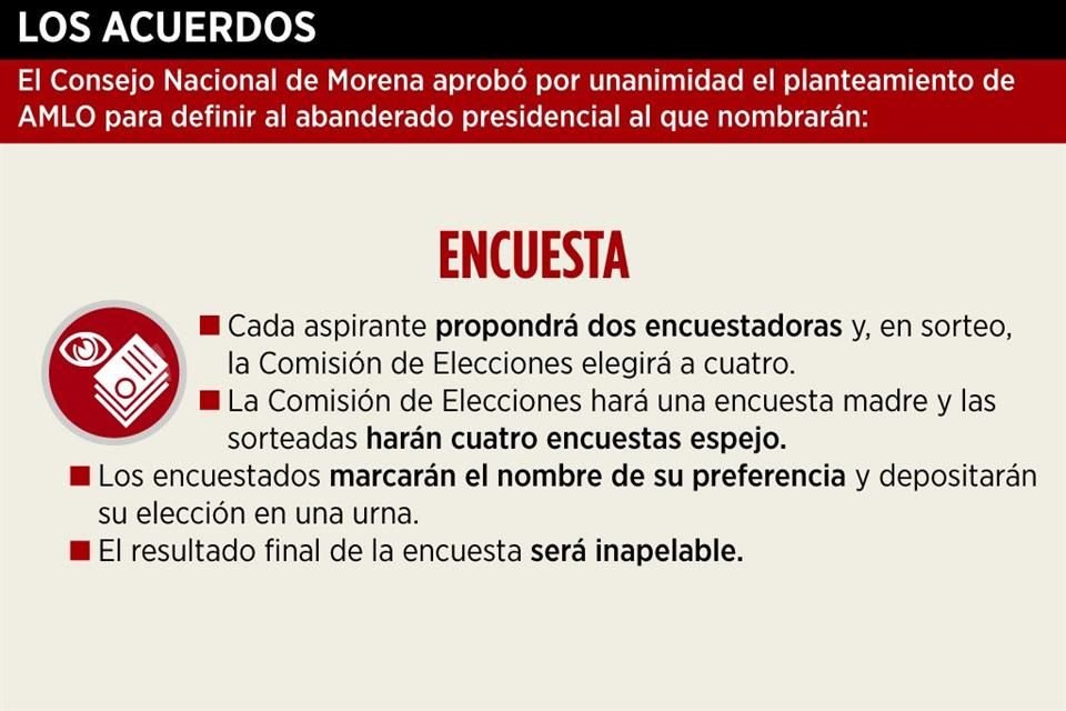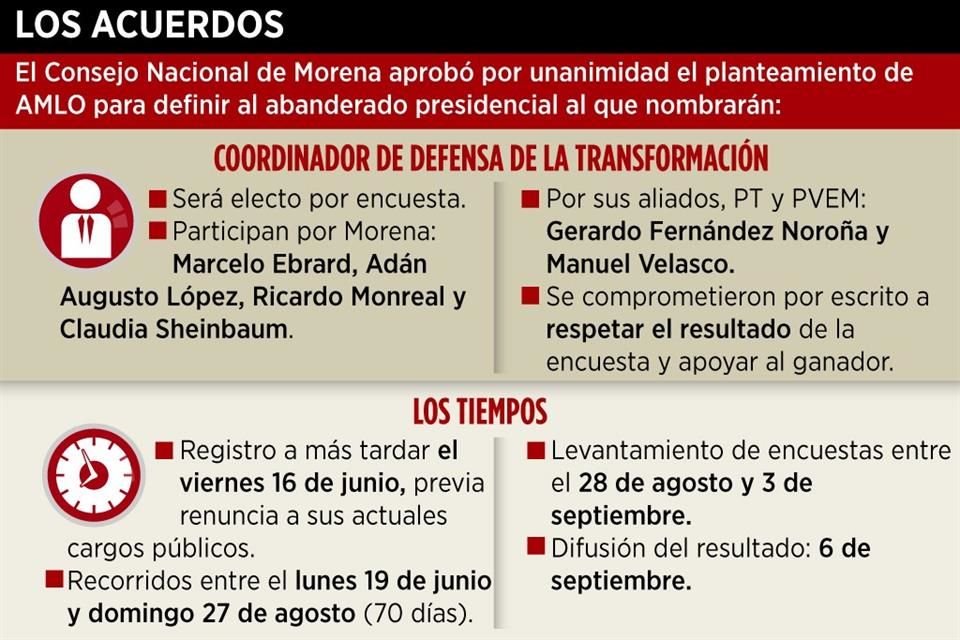Los aspirantes presidenciales de Morena pactaron las reglas de la sucesión en 2024 y determinaron que el abanderado será el ganador de una encuesta oficial con cuatro ejercicios espejo, cuyos resultados se conocerán el 6 de septiembre.