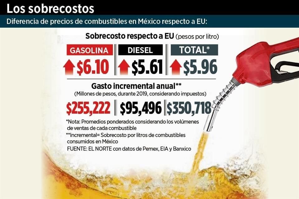 Gracias a los altos impuestos que carga México a los combustibles, a las ineficiencias en las refinerías de Pemex y a los costos de logística, los conductores y transportistas mexicanos pagan 351 mil millones de pesos (unos 18.2 mil millones de dólares) más por la gasolina y el diesel de lo que les hubiera costado comprarlos en Estados Unidos.