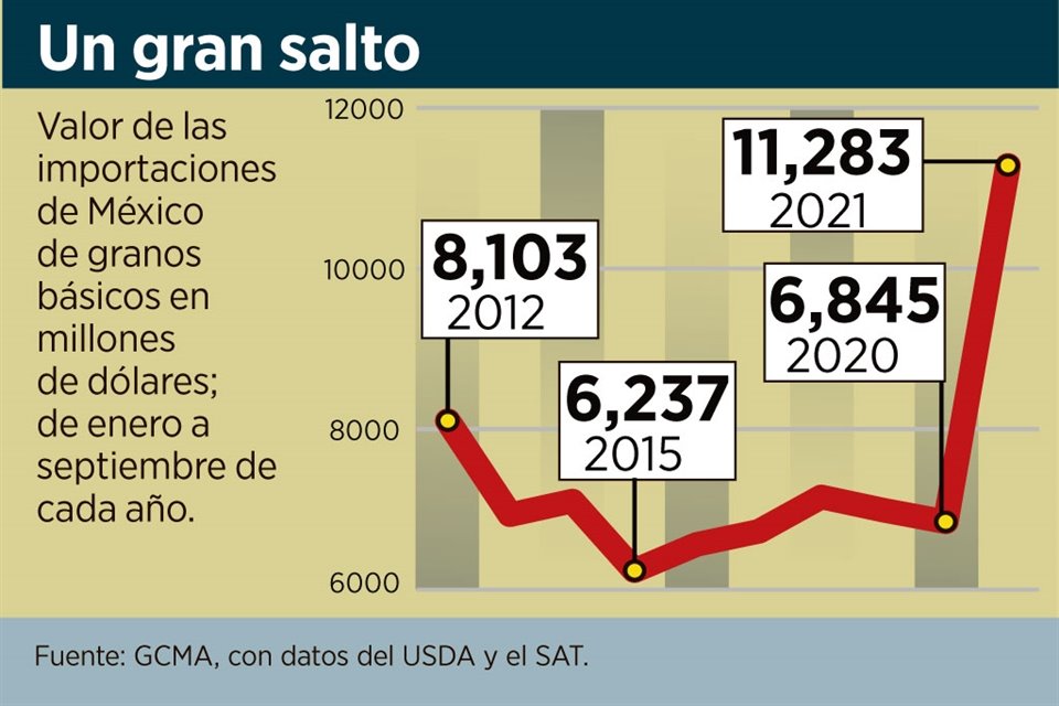 Al cierre del tercer trimestre de este año, el valor de las importaciones de granos básicos creció 65 por ciento respecto al mismo periodo del 2020, representando el pago récord de 11 mil 283 millones de dólares, esto es 4 mil 437 millones más, revela un análisis del Grupo Consultor de Mercados Agrícolas (GCMA).