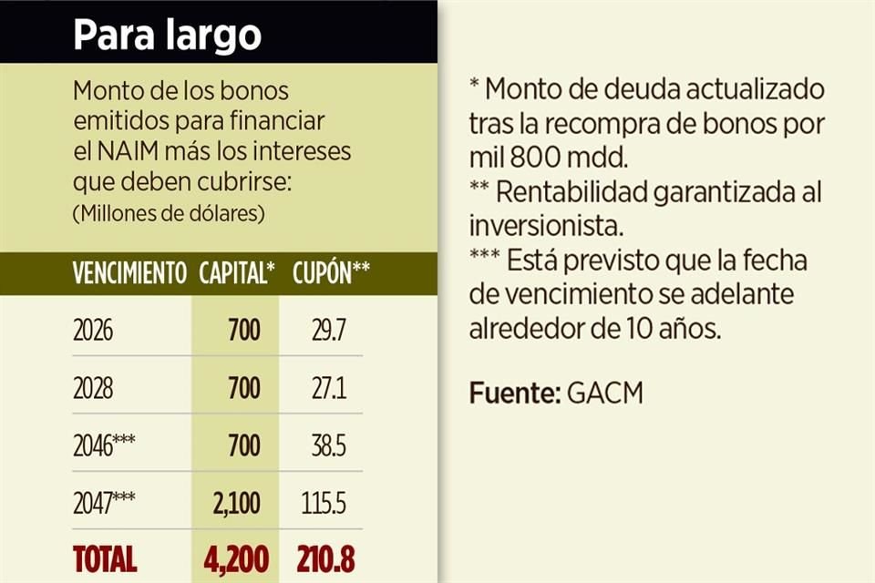 A partir de este año y hasta 2026, la deuda por el cancelado aeropuerto de Texcoco costará anualmente 210.8 millones de dólares o 4 mil 24 millones de pesos, según el Grupo Aeroportuario de la Ciudad de México (GACM).