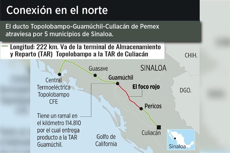 Para combatir el huachicol en Sinaloa, Pemex determinó desde el 1 de agosto suspender el envío de combustible en el ducto Topolobampo-Guamúchil-Culiacán, un sistema de 222 kilómetros de longitud; sin embargo, el crimen organizado aprovechó para robar 18 kilómetros de tuberías.
