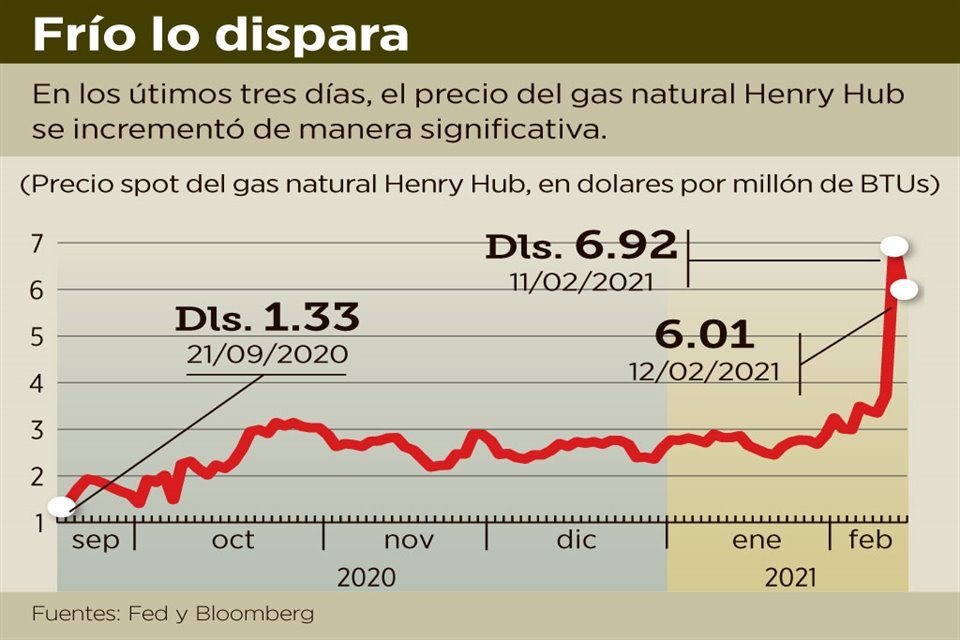Debido al descenso significativo de la temperatura en Estados Unidos, el precio del gas natural en aquel país se disparó en los últimos días, con posibles impactos en el muy corto plazo a la CFE y la industria en México.