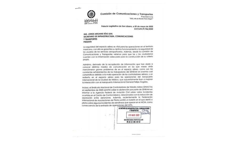 La Comisión de Comunicaciones y Transportes de la Cámara de Diputados pidió a Jorge Arganis Díaz Leal, Secretario de Infraestructura, Comunicaciones y Transportes, detener las operaciones en el Aeropuerto Internacional Felipe Ángeles (AIFA) hasta que se garantice la seguridad de los pasajeros.