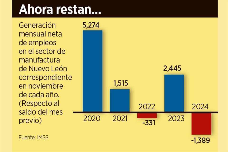 En noviembre pasado, el sector de manufactura de Nuevo León, el principal generador de empleo en la Entidad, registró una caída neta de mil 389 plazas de trabajo, la peor cifra en este año y que contrasta con las 2 mil 445 que generó en igual mes del 2023.
