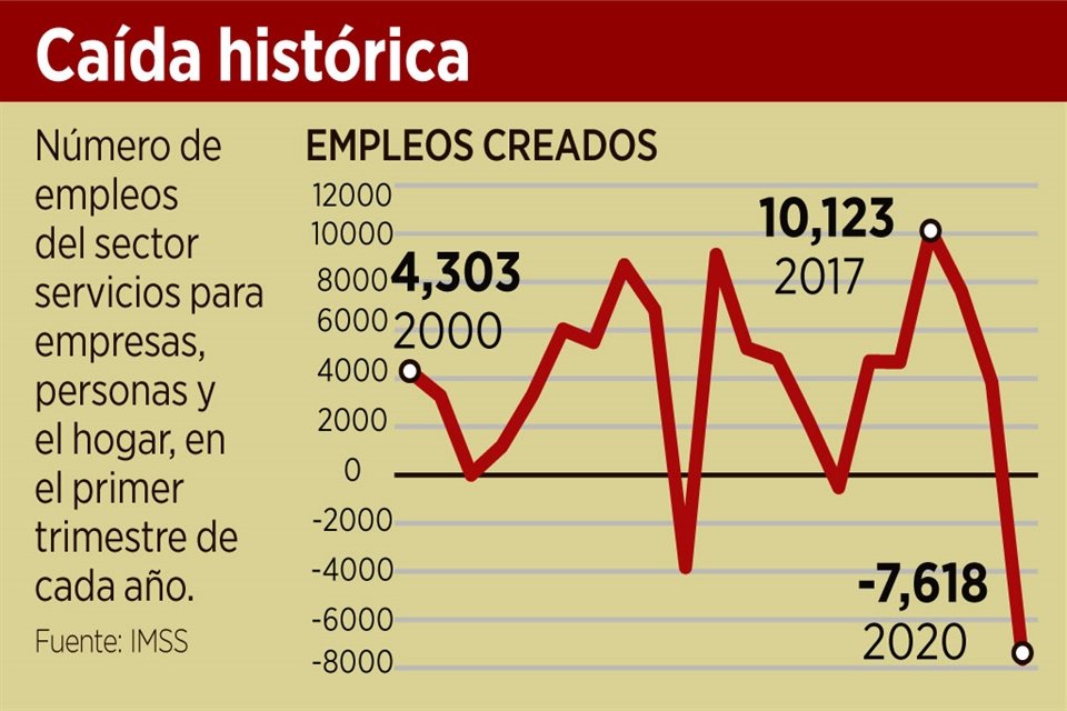 En marzo, el sector de servicios para empresas, personas y el hogar fue el que más recorte de personal realizó en Nuevo León, con un total de 4 mil 765 plazas, la caída más profunda en 20 años, en el histórico público del IMSS.
