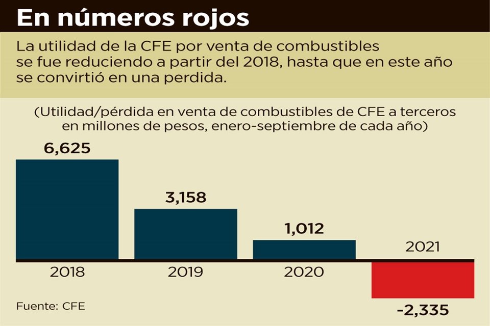 Durante los primeros nueve meses de 2021, la CFE registró una pérdida por 2 mil 335 millones de pesos en la venta de combustibles, el primer año en que esto sucede desde que hay datos disponibles, a partir de 2018.