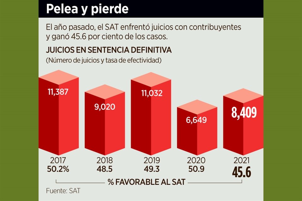 Del total de juicios que el Servicio de Administración Tributaria (SAT) enfrentó contra contribuyentes durante 2021, perdió 54.4 por ciento, la mayor proporción de los últimos cinco años.