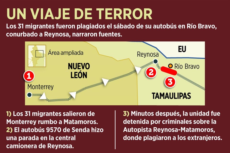Pese a que defensores de los migrantes llevan semanas alertando por un agravamiento en los secuestros en la frontera de Tamaulipas, criminales interceptaron el sábado un autobús de pasajeros y plagiaron a 31 extranjeros en plena Autopista Reynosa-Matamoros.