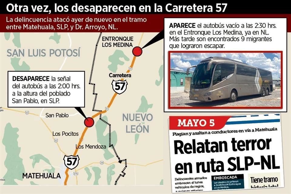 Apenas dos semanas después de que regiomontanos relataron cómo fueron plagiados en la "ruta del terror" de la Carretera 57, cerca de Matehuala, en los límites entre San Luis Potosí y Nuevo León, la delincuencia secuestró este lunes a un grupo de 50 migrantes y dos operadores en un autobús en la misma zona.