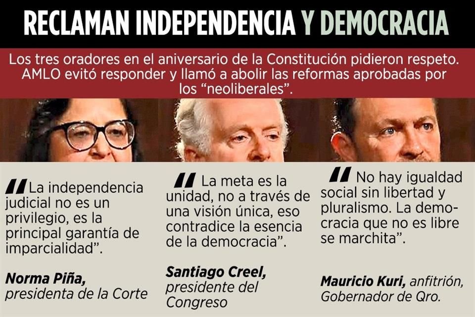 La presidenta de la Suprema Corte de Justicia de la Nación, Norma Piña, exigió respeto a la división de poderes y a la independencia del Poder Judicial, durante la ceremonia por el 106 aniversario de la Constitución.