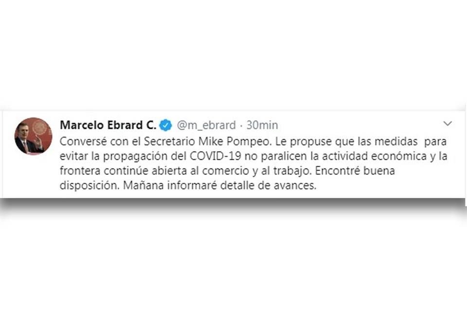 El Gobierno de México propuso al estadounidense no cerrar la frontera entre ambos países ante la propagación del Covid-19.