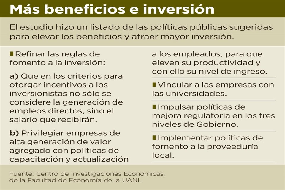 Nuevo León lidera diversos indicadores económicos en el País gracias a la Inversión Extranjera Directa (IED) que ha llegado, pero ante su bajo efecto multiplicador, lo recomendable es que los incentivos que se otorguen también condicionen mejores salarios.