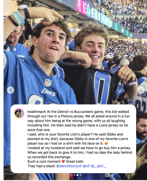 La directiva de los Lions vio un video en el que la pareja regaló un jersey con el apellido del corredor Jahmyr Gibbs a unos jóvenes que estaban en el estadio en el partido del Monday Night Football ante los Buccaneers y como recompensa recibieron jersey y boletos para el partido que definirá al campeón de la NFL el 8 de febrero próximo.