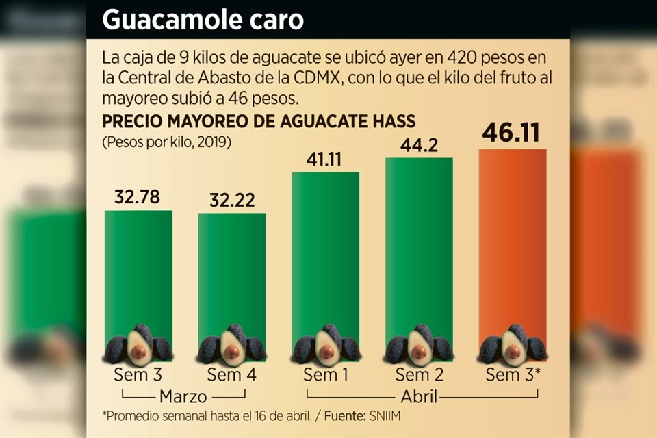 El precio del kilo de aguacate hass al mayoreo en la central de abasto pasó de 32.22 pesos a finales de marzo a 44.22 pesos para la segunda semana de abril. Crédito: Frida Andrade