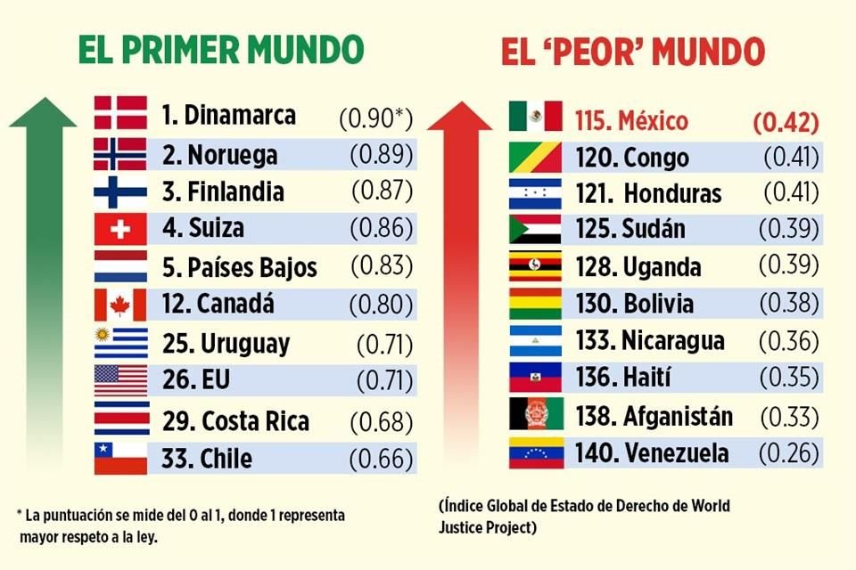 Por cuarto año consecutivo, México retrocedió en el Índice Global de Estado de Derecho de World Justice Project (WJP), al obtener un puntaje de 0.42 y colocarse en el lugar 115 de 140 países evaluados.