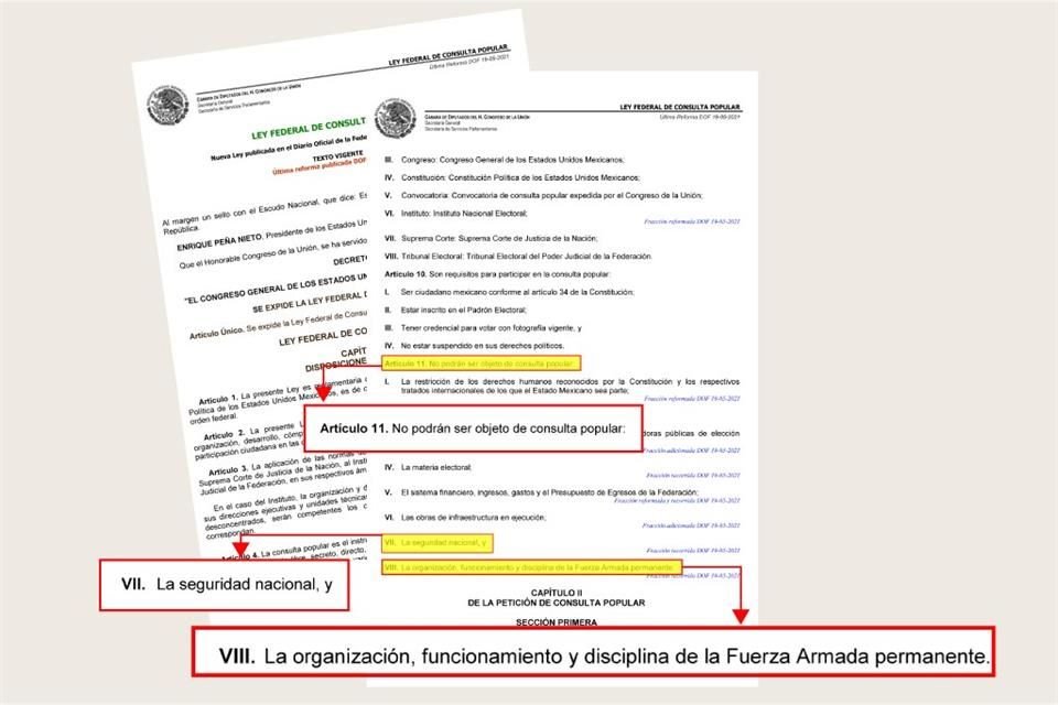 El Presidente Andrés Manuel López Obrador propuso ayer celebrar una consulta sobre el uso de las Fuerzas Armadas en tareas de seguridad pública y extender su presencia en las calles hasta 2028, pese a que la Constitución y la Ley Federal de Consultas Populares prohíben someter a consulta popular la seguridad nacional.