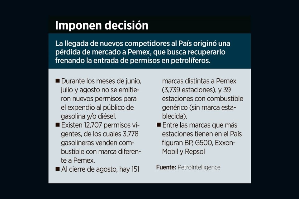 Existen alrededor de 350 permisos frenados para gasolineros que quieren cambiar de marca o abrir una nueva gasolinera debido a la intención del Gobierno federal de rescatar a las empresas productivas del Estado y alinear a los reguladores a esa política, lo que pone a los privados en desventaja.
