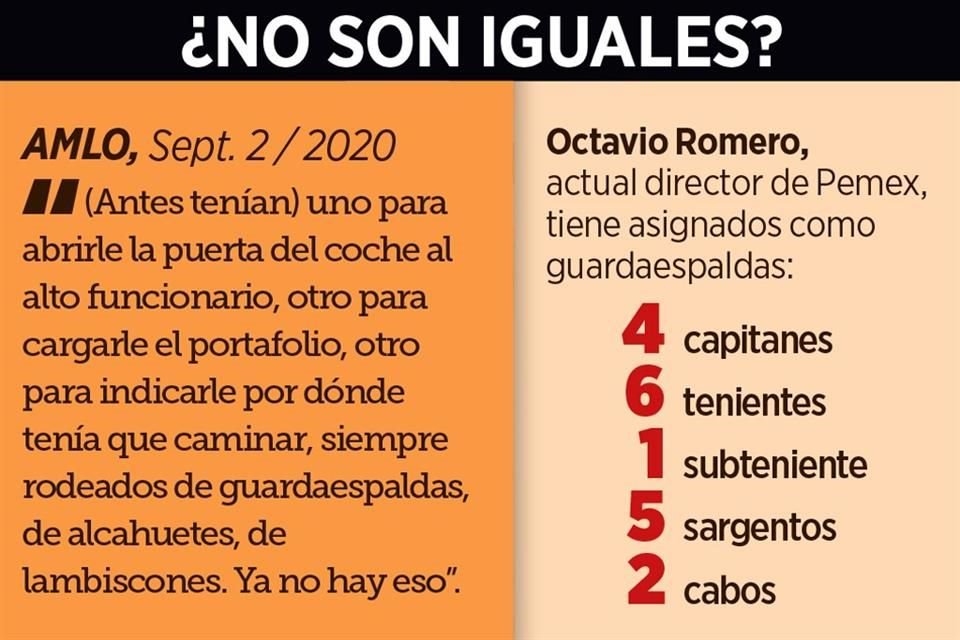 Aunque el Presidente Andrés Manuel López Obrador aseguró que en su Gobierno los funcionarios públicos no derrochan en escoltas, el director de Pemex, Octavio Romero Oropeza, tiene 18 militares asignados a su protección personal y la de sus hijas María Fernanda y Ximena.