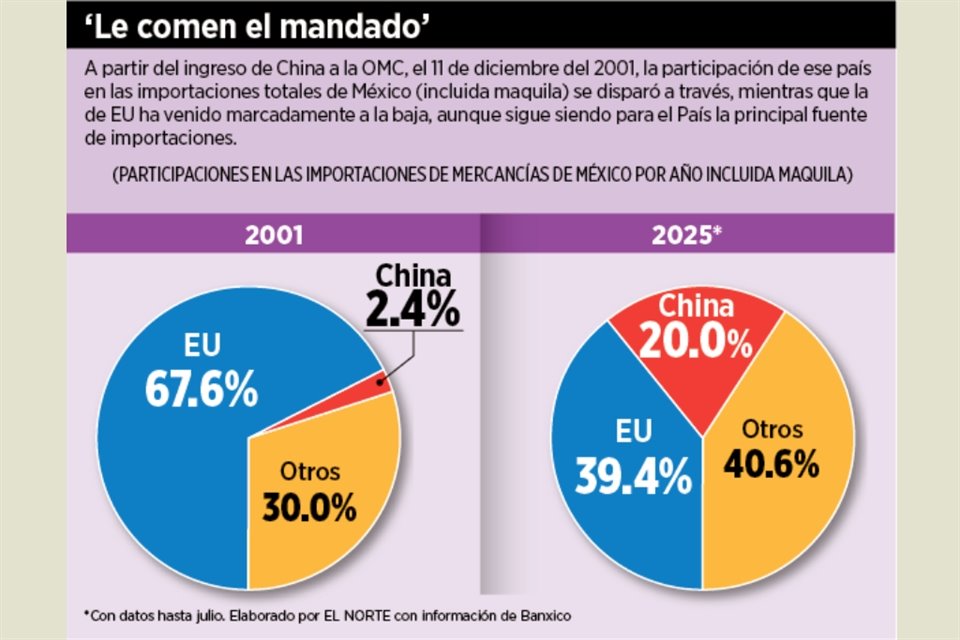 Desde su ingreso a la Organización Mundial de Comercio en el 2001, China ha acelerado su participación en las importaciones que hace México al mundo, al pasar del 2.40% a 20% a julio del 2025.
