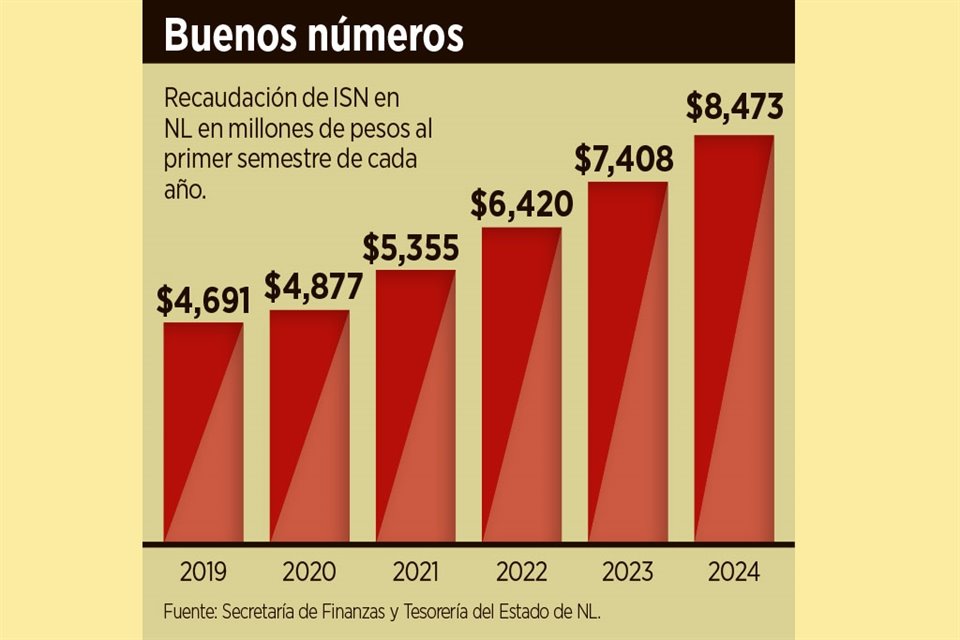 En el primer semestre del año, Nuevo León recaudó por Impuesto Sobre Nóminas (ISN), su principal fuente de recursos propios, 8 mil 473 millones de pesos, 14.3 por ciento más en términos nominales respecto al mismo periodo del 2023, de acuerdo con el reporte del segundo trimestre de la Cuenta Pública del Estado.