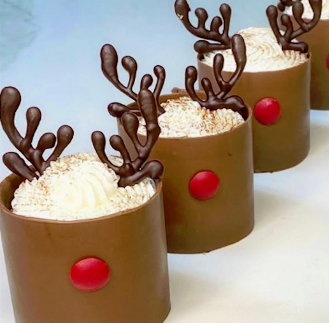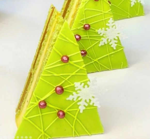 Cortar tres cuadros de biscuit de 20 x 20 cm. Colocar el primer cuadro dentro de un marco de 20 x 20 cm. Vaciar la confitura de chabacano. Colocar una segunda capa de biscuit. Vaciar el cremoso de mandarina. Terminar con el tercer cuadro de biscuit. Congelar. Cortar por la mitad (dos rectángulos de 10 cm). De cada rectángulo cortar triángulos de 6 cm de base. Cortar copos de nieve con la hoja de arroz. Colocar en cada triángulo la decoración de chocolate pegando con un poco de brillo neutro.