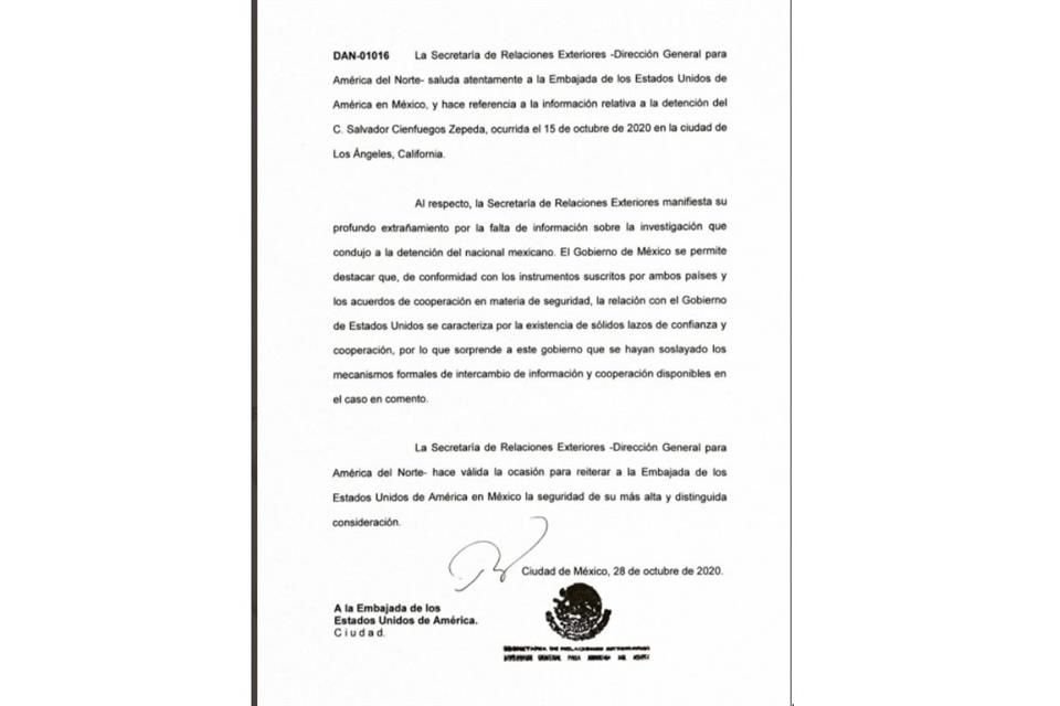 La Secretaría de Relaciones Exteriores (SRE) publicó la carta diplomática enviada a Estados Unidos en la que reclamó a la Administración Trump por no haber compartido información sobre la investigación en contra del ex Secretario de la Defensa Nacional Salvador Cienfuegos.