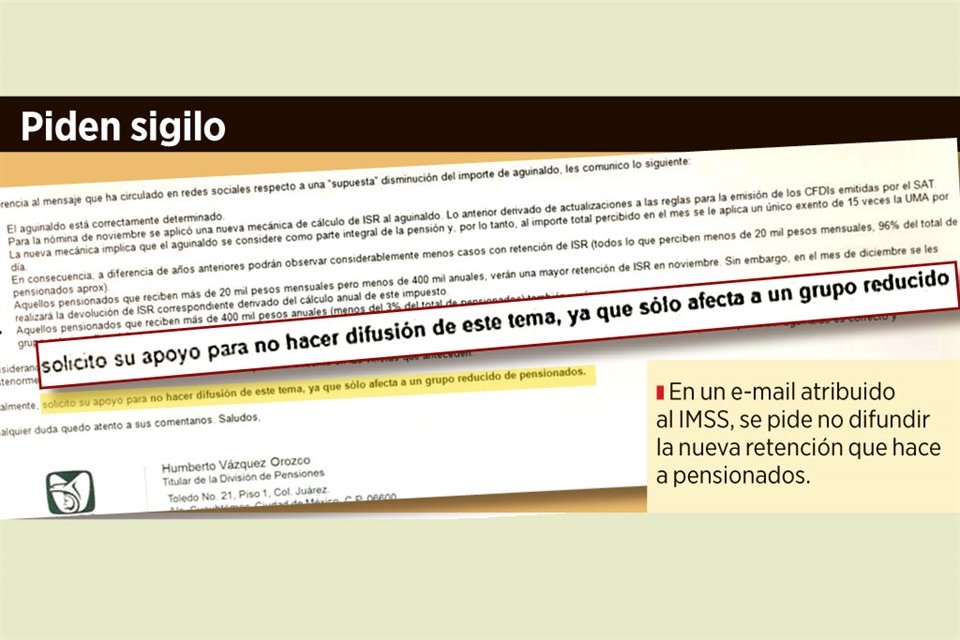 Luego de que NEGOCIOS publicó ayer que, a diferencia del año anterior, el IMSS está reteniendo en este mes el ISR a la pensión y el aguinaldo sumados -cuando correspondiera por altos ingresos-, el Instituto lo reconoció, pero minimizó las afectaciones.
