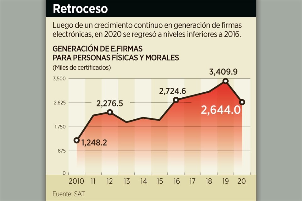 Por el cierre de oficinas y la menor disponibilidad de citas, el Servicio de Administración Tributaria (SAT) emitió y renovó 22 por ciento menos firmas electrónicas, conocidas como e.firmas.