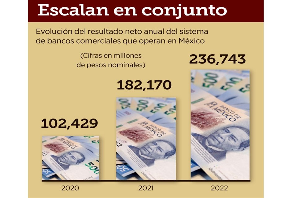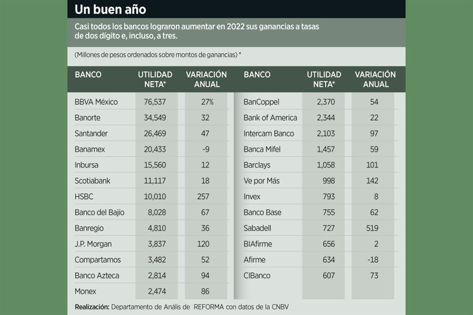 Durante el 2022, los bancos comerciales en México registraron en su conjunto una ganancia histórica para un año entero, muestran cifras de la Comisión Nacional Bancaria y de Valores (CNBV).