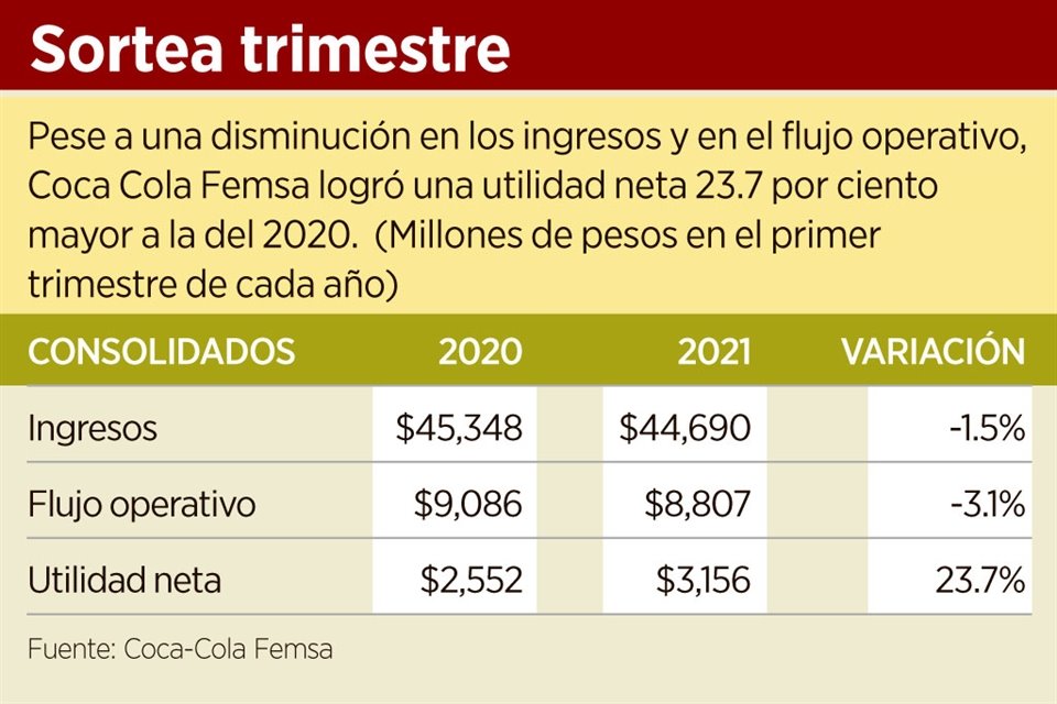 El tipo de cambio desfavorable en Sudamérica impactó el flujo operativo de Coca Cola Femsa (KOF), que registró una baja del 3.1 por ciento, para pasar de 9 mil 86 millones de pesos durante el primer trimestre del 2020, a 8 mil 807 en similar periodo del 2021.